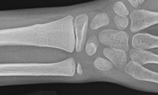 This is a simple “buckle” fracture of the end of the radius, also called a “torus” fracture.
