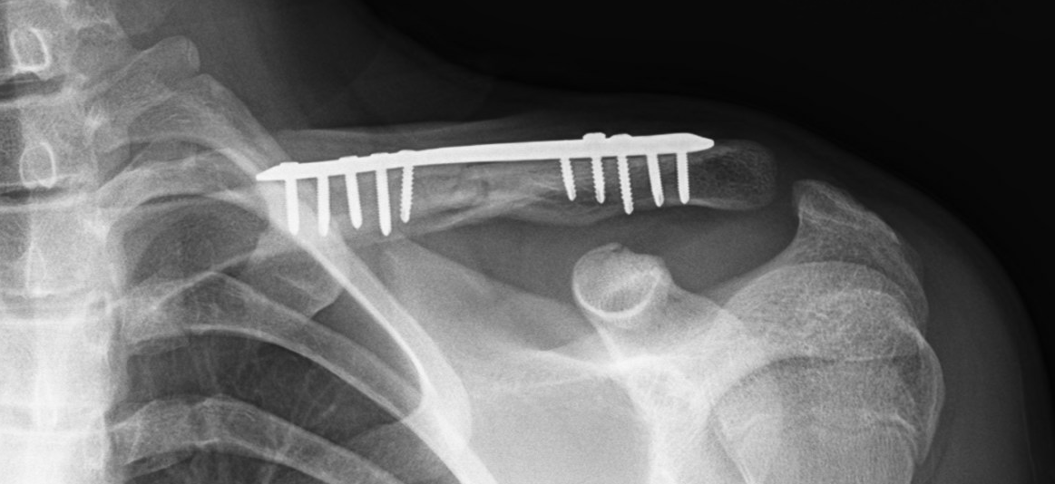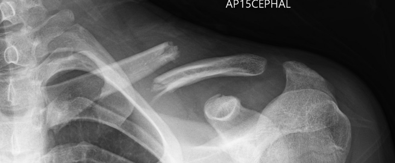 This is a “displaced” clavicle (collarbone) fracture. The fracture is also “shortened” as the ends of the bone are overlapping each other.