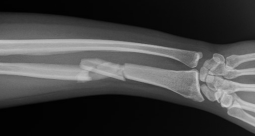This is a “comminuted” radius shaft fracture. Notice the multiple fracture fragments.